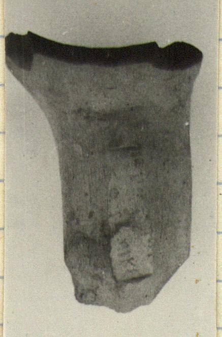 | Description: | Slightly rising; broad, ribbed, broken at curve. Coarse clay; red, grey at core; light slip. Impression incomplete above an d below; retrograde. | |