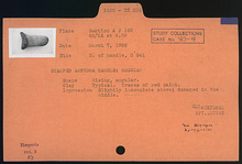 | Description: | Rising, angular. Typical clay; traces of red paint. Impression slightly incomplete above; damaged in the middle. | |