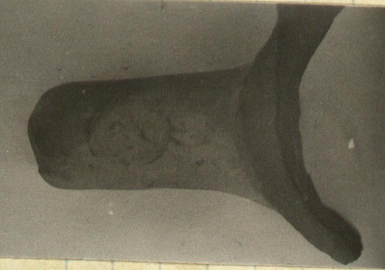 | Description: | Large fragment with part of rim. Angular, rising. Typical clay. Impression set carelessly and close to neck. Only a few letters legible. | |