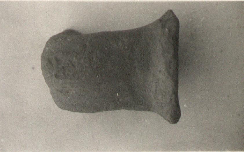 | Description: | Broad; ribbed; rises and curves down abruptly close to neck. Coarse clay, somewhat micaceous; red, greyish at core; dark wash (vestiges). Impression incomplete on right end. | |