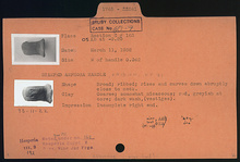 | Description: | Broad; ribbed; rises and curves down abruptly close to neck. Coarse clay, somewhat micaceous; red, greyish at core; dark wash (vestiges). Impression incomplete on right end. | |