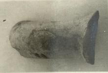 | Description: | Arched, rising, broken at curve, neck not preserved. Typical clay; red core very distinct. Impression nearly worn away; traces of rose and one or two letters. | |