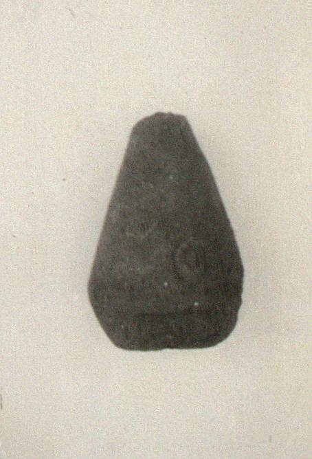 | Description: | Loom weight, roughly conical with lower edge bevelled; chipped above and below. Coarse buff clay, baked pinkish one side. Twice stamped; above angle, neat upright oval seal with tree(?). Below angle, same side, rectangular framed impression. | |