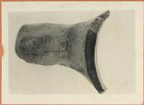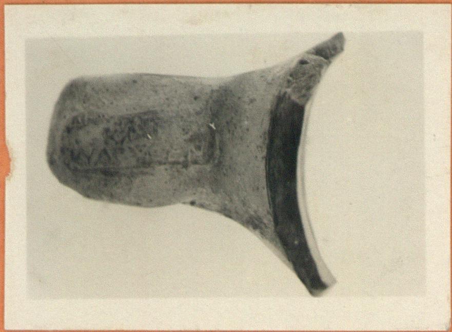 | Description: | Knidian shape; part of rim preserved; broken at curve. Coarse yellowish-red clay, greyish at core; light slip. Impression sharp, but incomplete above and worn down middle. | |