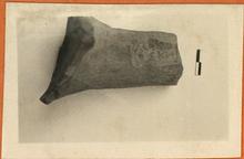 | Description: | Small fragment, meets the neck very obliquely; otherwise typical. Medium coarse clay, greyish-red, yellow in surface breaks. Impression broken away at right, incomplete and damaged above. | |
