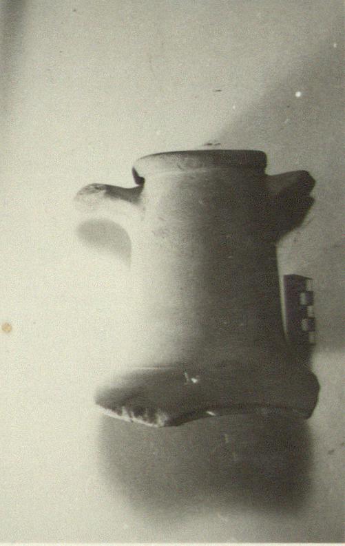 | Notes: | This group (SS 3784-87; SS 3790-3813; SS 3901; P 5524-5536) was found on 17-19 April. This footing trench is 1.00m. wide on the west and 0.73m. on the north, except just as the corner where the north cutting widens to ca. 1.00m. (cf. plan, p. 667); it is 1.62m. deep, from stereo on the west. The upper part of the trench was filled with thrown-in bedrock which had not many sherds in it and no coins. At about 0.67m. from stereo at the bottom the hardpacked bedrock fill ceased; water, and this collection of pottery, with practically no packing about it, appeared. In addition to the catalogued objects there are tins and trays of sherds, the majority similar coarse ware. None of the few glazed bits found need be later than the early third century. Date: deposit of ERh(VG)* Dim: Neck 0.133x0.098* | |