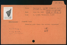 | Description: | Stamped tile. Greenish-gray clay. The letters impressed. Cf. A 136 and A 234 from same series. | |