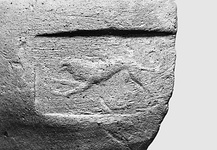 | Description: | Sofr buff micaceous clay; large pink core. Emblem: a lion, in profile galoping left; no letters(?). Stamp very carefully made. Early Thasian. | |