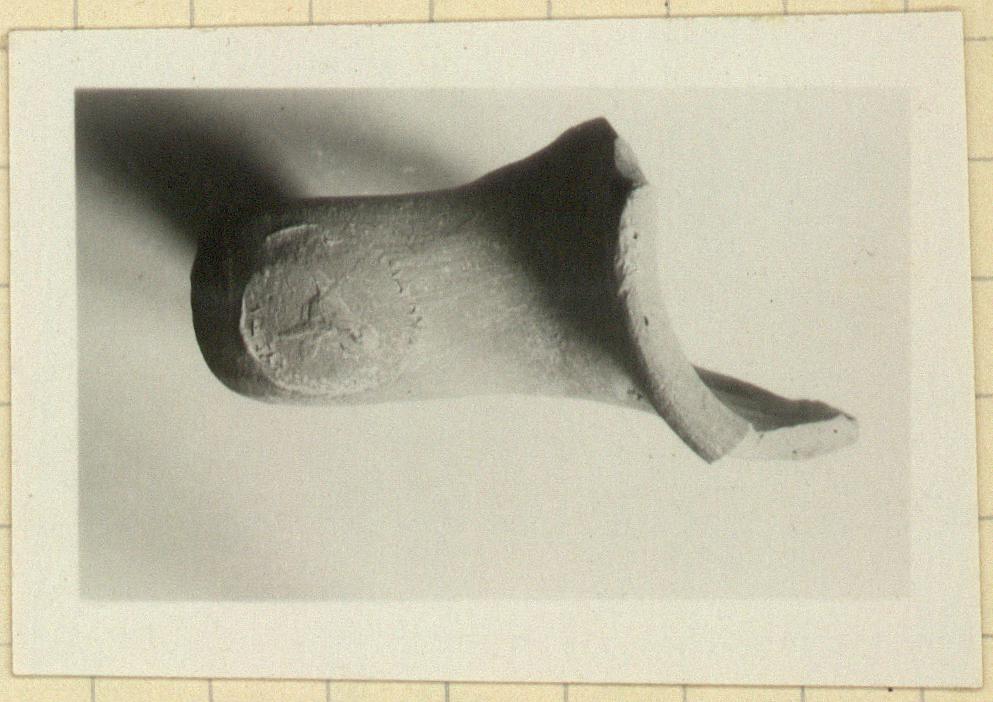 | Description: | Rather arched; part of rim preserved. Coarse clay fired dark grey save for surface layer about 0.001m. thick of russet with traces of light slip. Large circular impression of a fairly sharp die set shallow and overlapping. Retrograde. | |
