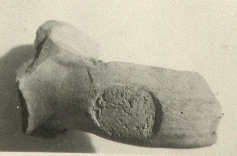 | Description: | Typical slim handle, rather descending. Large circular impression, from carelessly made clay die(good example for photograph); slightly incomplete both sides. | |