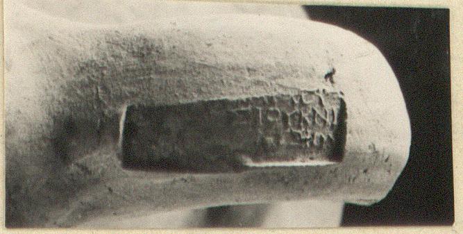 | Notes: | Cxt: dep 57(VG)* Dim: L of stp 0.047m(VG)* Par: "stp w/ "[...] Dionysios" found in Corinth Asklepeion - see Grace 1934, p251; but this certainly looks 3rd quarter" (VG)* Msc: "missing [...], below sharp sqr collar ring" (VG)* | |