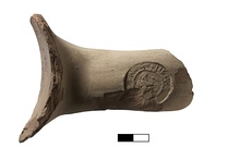 | Description: | Probably angular handle; part of rim preserved. Rather coarse red clay, with gritty yellowish slip. Chipped impression from a rather hastily made die set in the clay while it was too wet; rose. | |