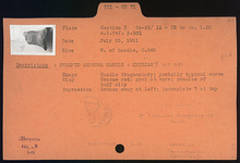 | Description: | Fragmentary handle; probably typical curve. Coarse red clay; grey at core; remains of buff slip. Impression broken away at left; incomplete(?) at top. | |