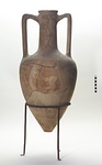 | Description: | Neck of amphora and rim with part of shoulder and both handles; missing lower part of handle; mended largely, restored in plaster; groove on neck 0.125m. below rim nearly all round; peg foot; blotch of rusted metal on side of neck. Capacity: (revised from wheat VG 1939 of 25.700) 26.200. | |