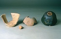 | Description: | Small conical handle. Pink clay, no glaze. An eleven petaled rosette is affixed to a small conical handle. Impression in Study Collections Case No. 48-Β. | |