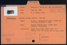 | Description: | Rising, irregularly ridged; broad, and widening slightly to neck. Coarse reddish-grey clay; redder near surface; micaceous. Right end of the impression broken away; worn; set neatly, but off centre and on down curve. | |