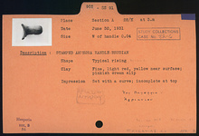 | Description: | Typical rising shape, arched. Fine clay, light red, yellow near surface; pinkish cream slip. Impression set with a curve; incomplete at top. | |