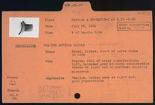 | Description: | Broad, ribbed, start of curve close to neck; rolled rim rather like Knidian but thinner. Coarse clay, full of large imperfections; buff, lavender grey at core; considerable traces of light red on surface; slightly micaceous. Shallow impression, broken away at right end; good preservation; set very closer to the neck, incomplete below. | |