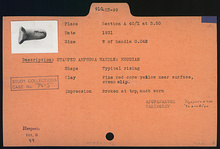 | Description: | Typical rising. Fine red clay, core yellow near surface; cream slip. Impression broken at top; much worn. | |