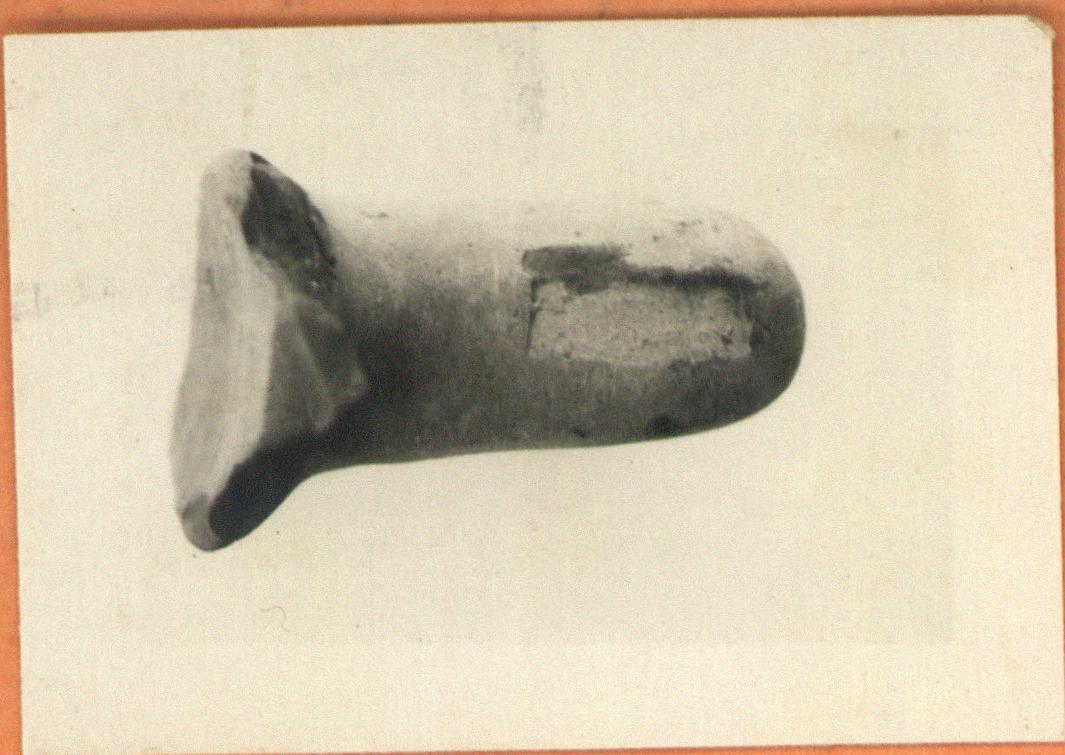 | Description: | Typical rising. Fine red clay, core yellow near surface; cream slip. Impression broken at top; much worn. | |