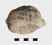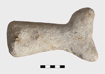 | Description: | Fragment missing at grinding end. Minor fractures. Handle shaped like a fish tail. Coarse grained grayish marble. | |