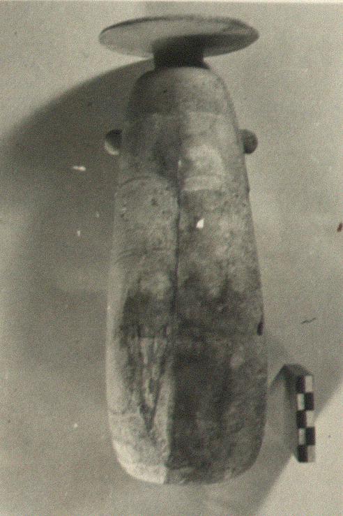 | Description: | Small hole rotted through, and some partial cracks, on weathered half. Where surface well preserved, veining of stone displayed in fine horizontal wavy lines. Under the small lug on either side a sort of tassel pendat, in slight relief. | |