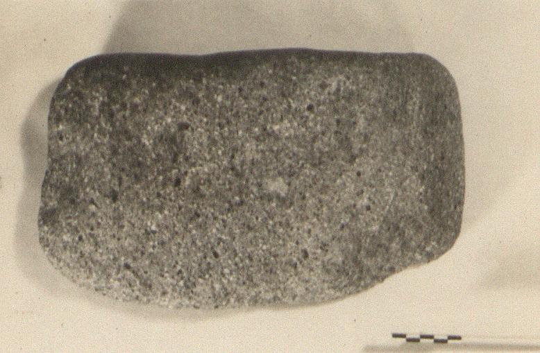 | Description: | Roughly rectangular stone, back worn and rounded at edges; face smooth worn and concave. Gray volcanic stone. Middle Helladic. | |