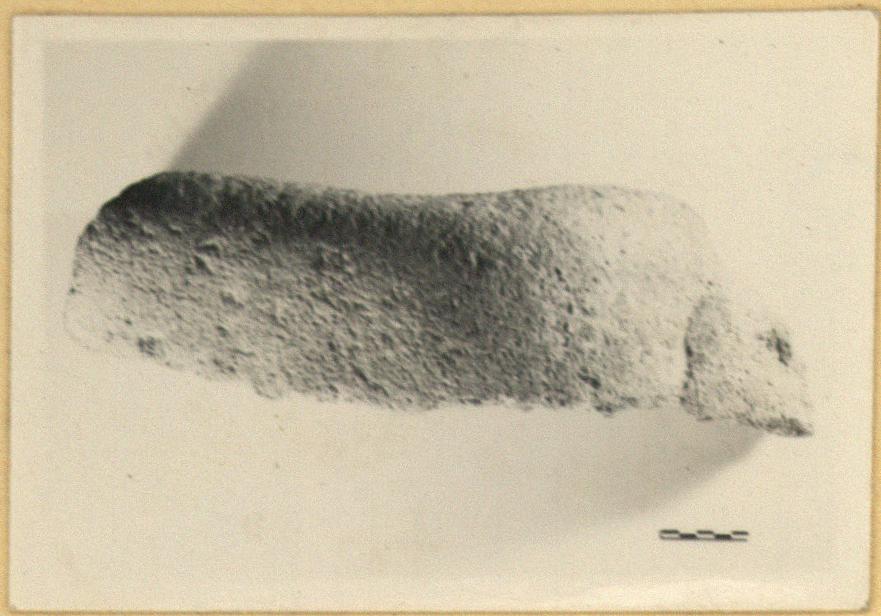 | Description: | Broken along one side. Triangular in section, the upper face slightly concave, and much worn from being ground upon. Reddish volcanic (?) stone, with much mica and large white bits. | |