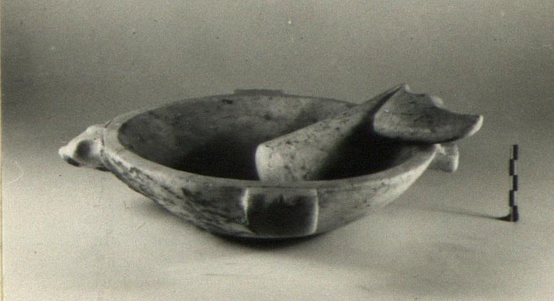| Description: | Found one inside the other; both intact except for chip missing from one handle of mortar. Mortar: shallow bowl on low raised base; on the rim, three lugs with finger mouldings, and a vestigial spout (no hole), set off from the wall outside by a raised triangle. Polished smooth inside and out; worn on the inside. Pestle: in the shape of a large bent thumb; chisel marks prominent, except on the worn surface of the working end. | |