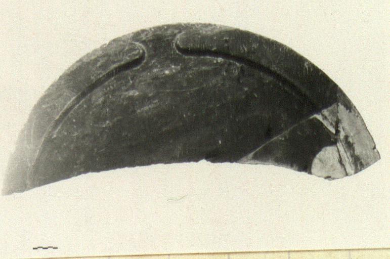 | Description: | About a third preserved in four joining fragments. Smooth and worn on top. Large shallow basin with low flat rim. Flaring stylized spout through part of rim. Rough picked on sides and bottom, as through to be set into something. Purple stone with black, white and gray intrusions; porphyry (?). White water (?) deposit of some sort. | |