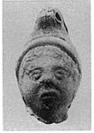 | Description: | Broken off at neck. A head in a high pointed cap. The top of the cap is pierced horizontally. Traces of red and white paint. Red clay. Late Roman. | |