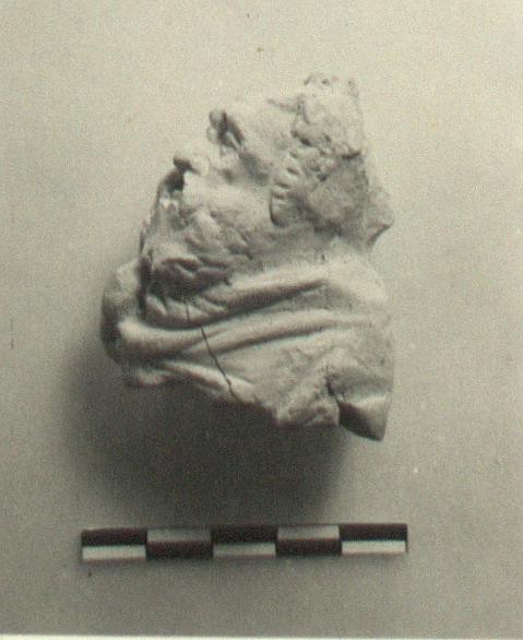 Hand-modelled. Remains of white paint, with red on hair and lips.