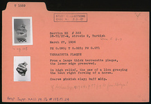 | Description: | Fragment from a large thick plaque, the lower edge preserved. In high relief, the paw of a lion grasping the bent right foreleg of a horse. Buff slip. Coarse pinkish clay. Cf. Archaeology 17 (1964), p. 97, fig. 10. | |