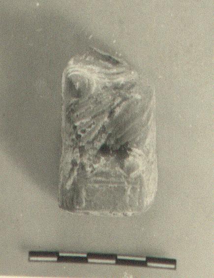 | Description: | All of back missing, and from above waist. Figure with feet on a small footstool. Crudelly modelled. White underpaint, and green and yellow overpaint. Red clay. | |