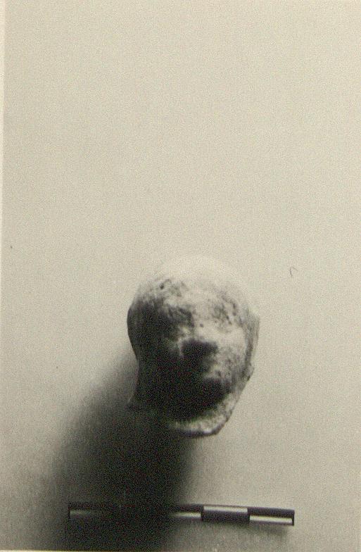 | Description: | Broken away below neck; bits missing at sides. Surface worn. Hair parted in center front, knotted behind. Traces of red and white paint, discolored, on face. Late Roman. | |