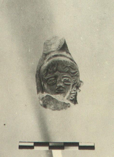 | Description: | First interpretation: female head. Preserved all around; broken at neck; cap chipped in front. Head with waved bands and curls, crowned by a high peaked cap. Prominent nose and sour-looking mouth. Traces of white and of added red color. Red clay, burned gray. | |