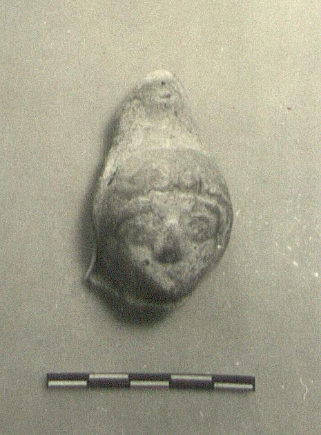 | Description: | First interpretation: female head. Front only preserved; broken at neck. Head beneath peaked cap. White paint with red decorations. Red clay. | |