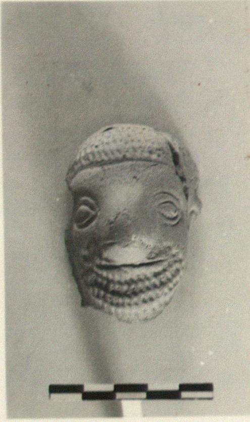 | Description: | Face of a bearded man. Very large nose. Gouged hair and beard. No color. Light red clay. | |