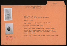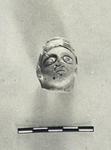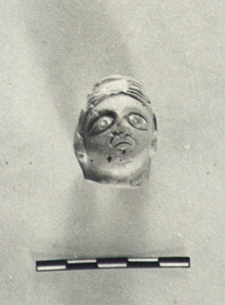 | Description: | Front of head preserved. Head with large features. The hair drawn down straight over the forehead. Looped over the ears. Traces of white paint around the eyes. Red clay. | |