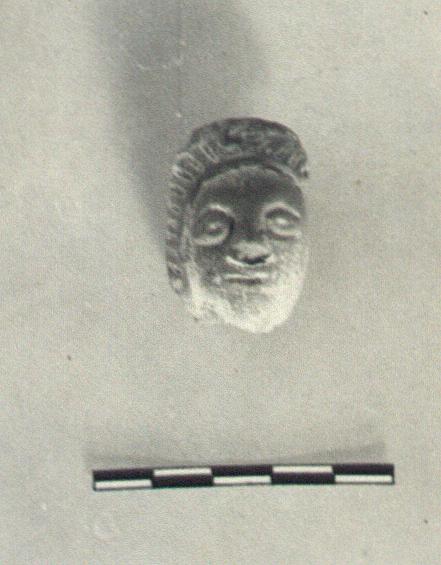 | Description: | Front of head only preserved, above chin. Hair in narrow parallel waves at right angles to face. Red paint. White slip. Red clay. | |