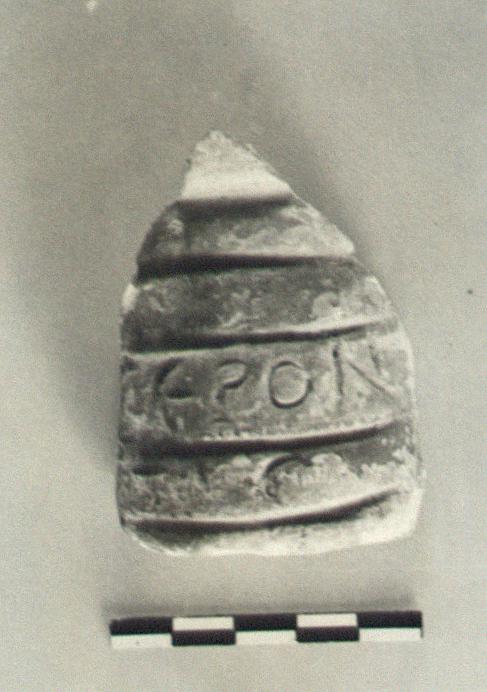 | Description: | Front half, with bottom preserved. Broken at top. Circular base with grooves and ridges. Inscription: Γ Ε Ρ Ο Ν Τ Ι C written in the damp clay. White slip, red paint. Red clay. <graphic> | |