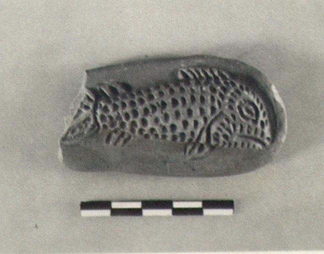 | Description: | An oval plaque with a fish right in relief. Part of left end missing. Details gouged. Fine red clay and wash (?). | |