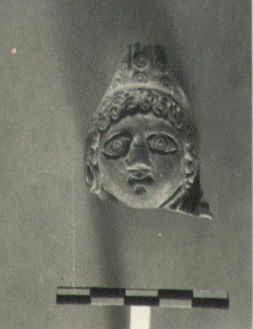 | Description: | Front of head only preserved. Characterless face with large nose and eyes. Tightly curled hair surmounted by a peaked cap which is ornamented with the same stamped circles used for the eyeballs. White slip, yellow paint. Buff clay. | |