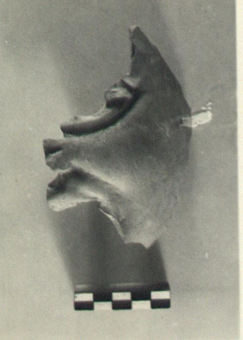 | Description: | Fragment from the left side of face, broken all around, preserving part of eye, nostril and mouth. Red clay, buff at inner surface. | |
