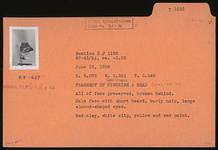 | Description: | All of face preserved, broken behind. Male face with short beard, curly hair, large almond-shaped eyes. White slip, yellow and red paint. Red clay. | |