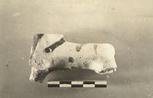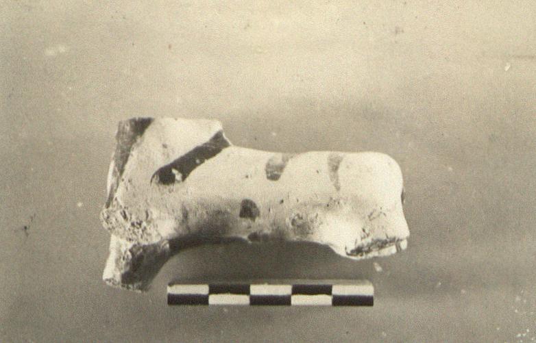 | Description: | Head and legs broken off. Tail stuck on along right hind leg. Glaze bands across body and chest, and down front legs and tail. Dull glaze, black to brownish red. Traces of added red between front legs and between hind legs. Pinkish buff clay. | |