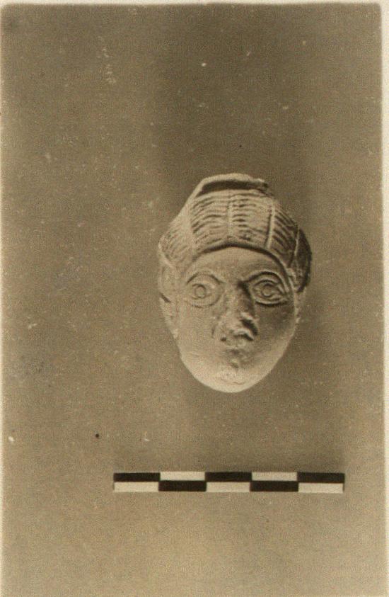 The hair in broad waves, rudely indicated. Nose and mouth damaged.