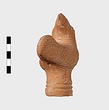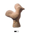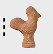 | Description: | Rattle in shape of cock on high roundish base. Pellets inside. Mold made as T 1421-1422 (lengthwise in two pieces). Small vent hole under tail. Details elaborately gouged. No trace of color. Pinkish buff clay. | |