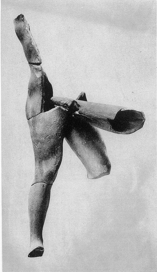 | Description: | First interpretation: standing figure. Head, shoulders, front of torso, much of back and lower left leg missing. One small piece of back does not join. End of phallus missing. The weight on the right leg; the left knee bent and the leg somewhat raised (perhaps resting on a support ?); the right arm appears to have been raised. A large phallus-shaped projection may have been a lamp. Careful modelling. No color. Fragmentary. Red clay. Cf. L 2396 and L 3277. ADDENDA: More fragments including left foot, found in going through sherds. | |