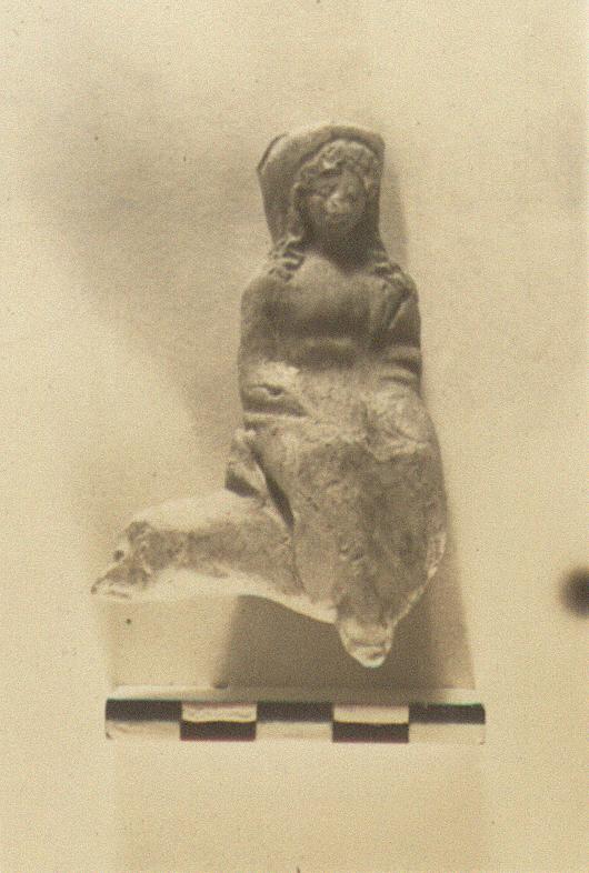 | Description: | Male figure sits sidewise on a dolphin. Tail of dolphin missing. Figure with long hair bound by a large wreath, and wearing an himation which leaves the right shoulder and chest bare. Back plain. Small hole near top. Traces of white color and red over. Buff clay. ADDENDA: Blue color on dolphin. Cf. T 1465. | |